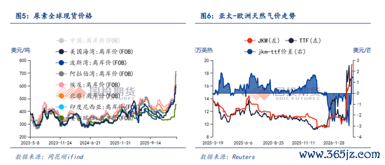 中东局势带动全球天然气价格出现大幅的飙升。2026年2月28日起截至3月17日HH(美国)天然气价格从2.859上涨到3.033,涨幅为6.09%。JKM(亚太)价格从10.725上涨到19.41,涨幅为80.98%。TTF(欧洲)价格从11.0571上涨到17.534,涨幅为58.58%。亚洲和欧洲气价涨幅较大。由于中东化肥主要原料是天然气(制造路径如下:天然气-合成氨-尿素,合成氨+磷矿石+硫酸制成磷肥),中东市场在尿素和磷肥上出口占比大,所以带来了新季作物的肥料供应中断以及成本提升的风险。以美国尿素为例,截至3月17日,美国尿素大颗粒现货FOB价格突破600美元/吨,较战争开始前上涨27.4%。从肥料投入的成本看,美国、巴西及印度市场尿素和磷肥用量在玉米、小麦占比偏大。美国和巴西的大豆在磷肥和钾肥上用量占比大。马来印尼棕榈油需要钾肥、磷肥和氮肥。后续新季作物一方面要关注成本的抬升,一方面要关注肥料短缺对单产的影响。